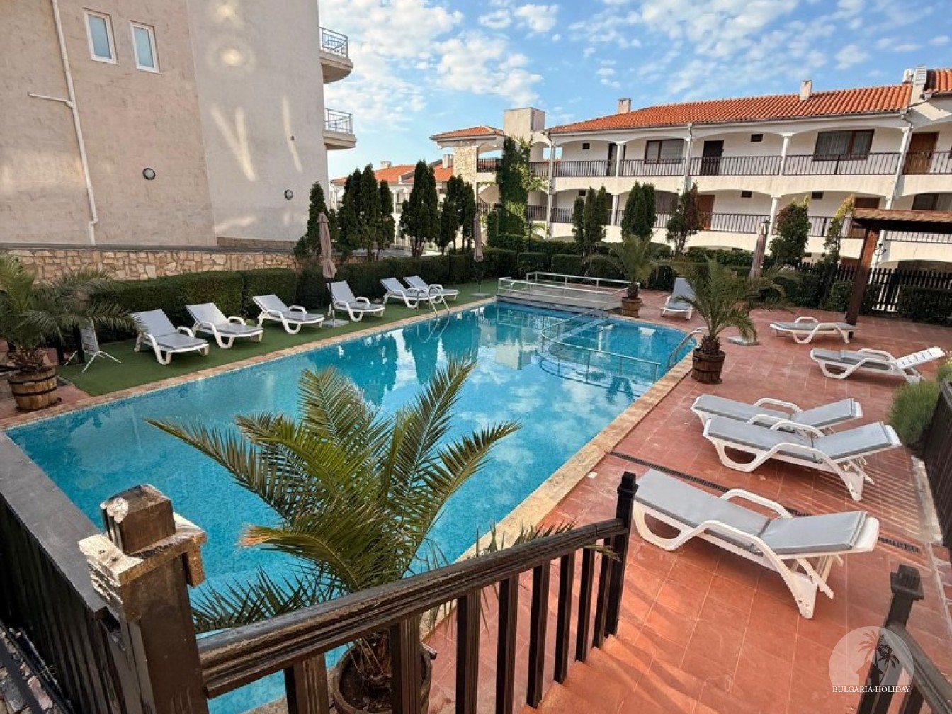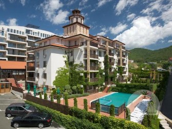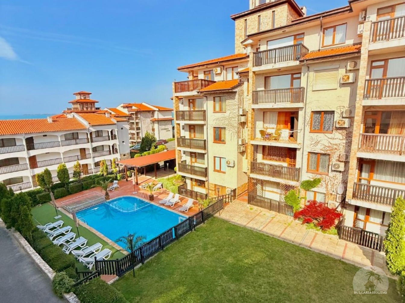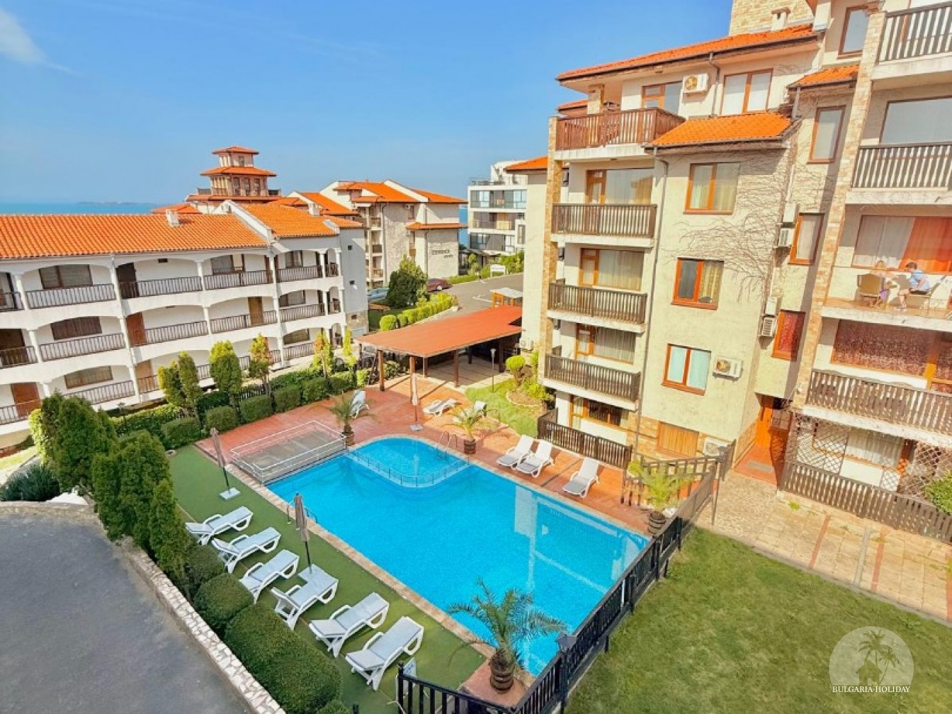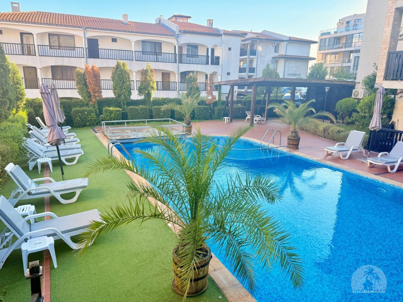 In the center of an almost closed circle there is a restaurant, a children's pool, an adult pool and two mini markets. 100 meters from the beach with a very convenient entry into the water for children (shallow), a trampoline, a restaurant on the beach, etc. Within walking distance there is a marina with beautiful yachts, restaurants for every taste (Russian, Bulgarian, Mediterranean cuisine, sushi bar), boutiques and shops are located along the marina.