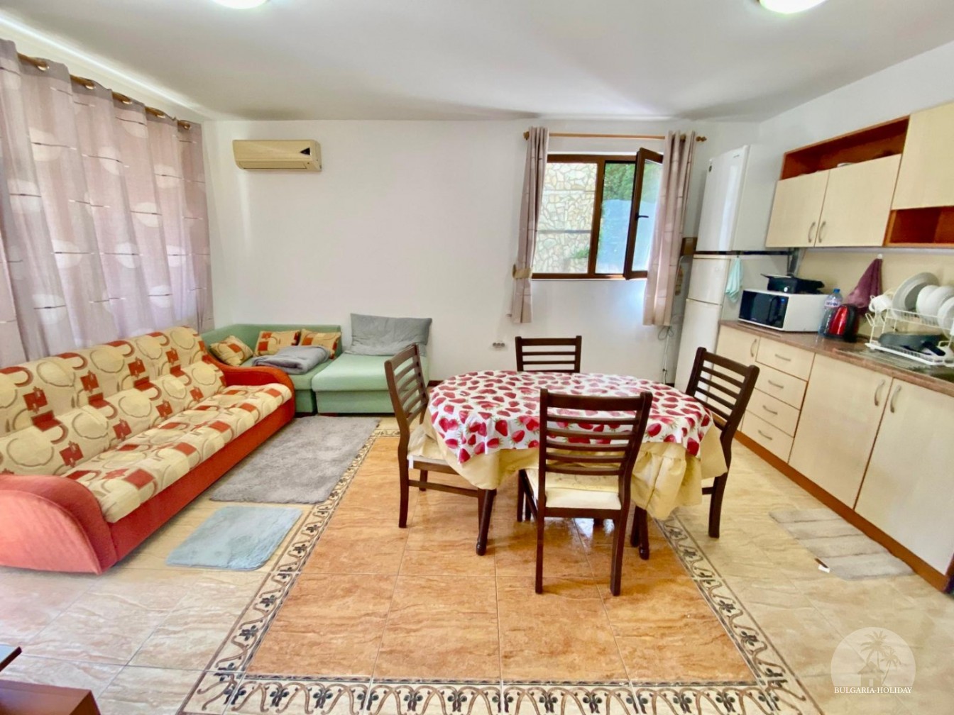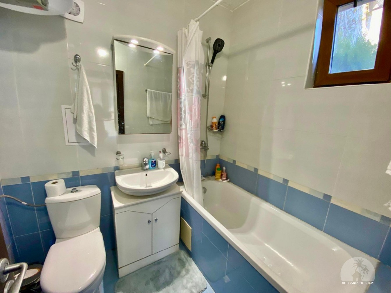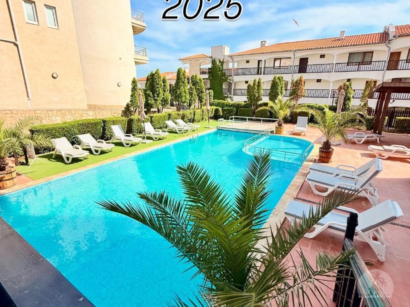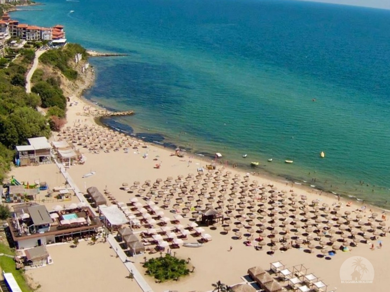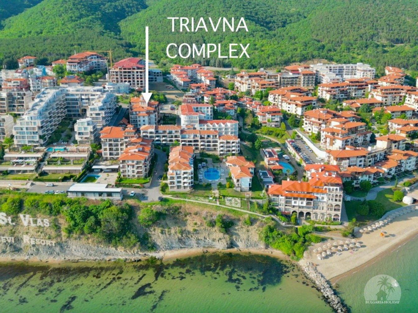 In the center of an almost closed circle there is a restaurant, a children's pool, an adult pool and two mini markets. 100 meters from the beach with a very convenient entry into the water for children (shallow), a trampoline, a restaurant on the beach, etc. Within walking distance there is a marina with beautiful yachts, restaurants for every taste (Russian, Bulgarian, Mediterranean cuisine, sushi bar), boutiques and shops are located along the marina.