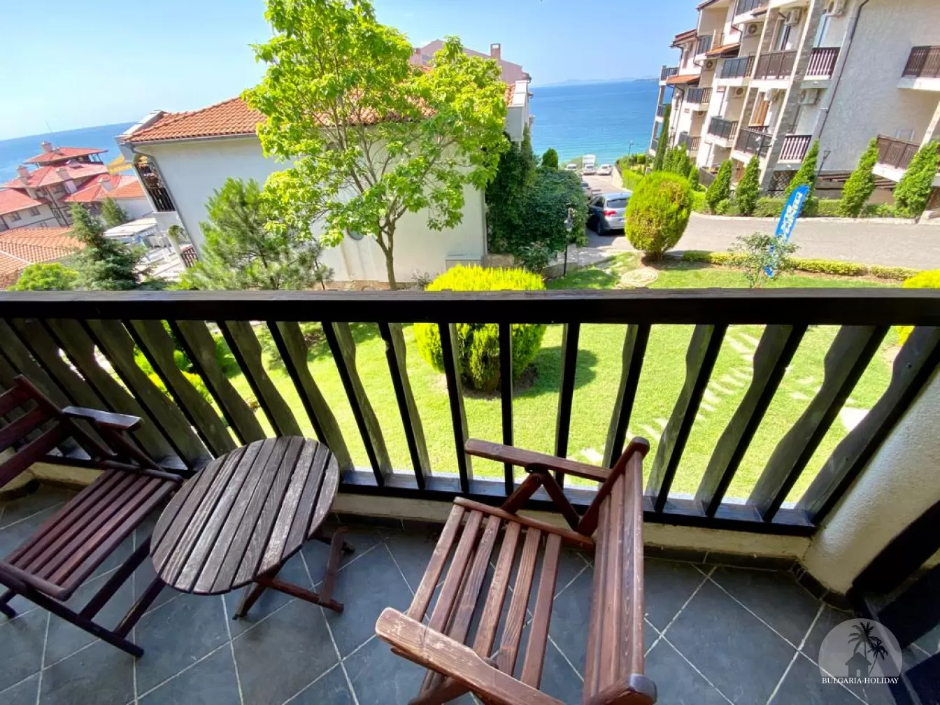 Studio for rent in Sun Coast complex, St. Vlas. The apartment is a studio (double bed with kitchenette, bathroom with shower), there is an armchair bed which can be taken out, so the apartment can sleep up to 3 people. The apartment has a terrace overlooking the sea, is on the second floor, the complex is located on the beachfront, has an outdoor pool, parking, and there is a store with the most necessary products. The apartment is fully equipped and furnished (dining table, chairs, closet, dishes, a washing machine and a refrigerator).